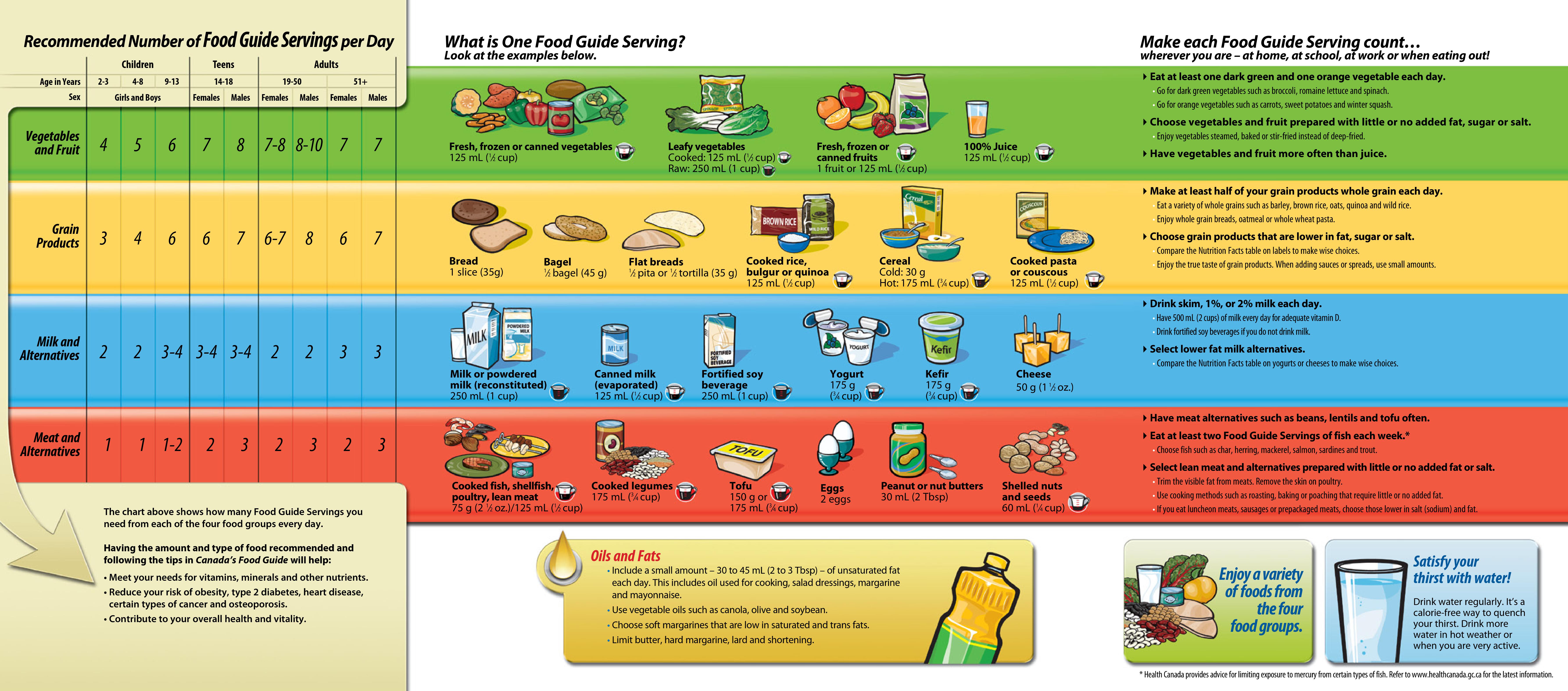 - Fats and oils get only a small mention at the end; they’re not even part of the main Food Guide. This indicates that they should be the lowest proportion of our diet. Far from the truth! We need them for health. Beyond that, some of their recommended fats include margarine (margarine!), canola oil, and soybean oil… all of which are damaged fats that should be avoided.